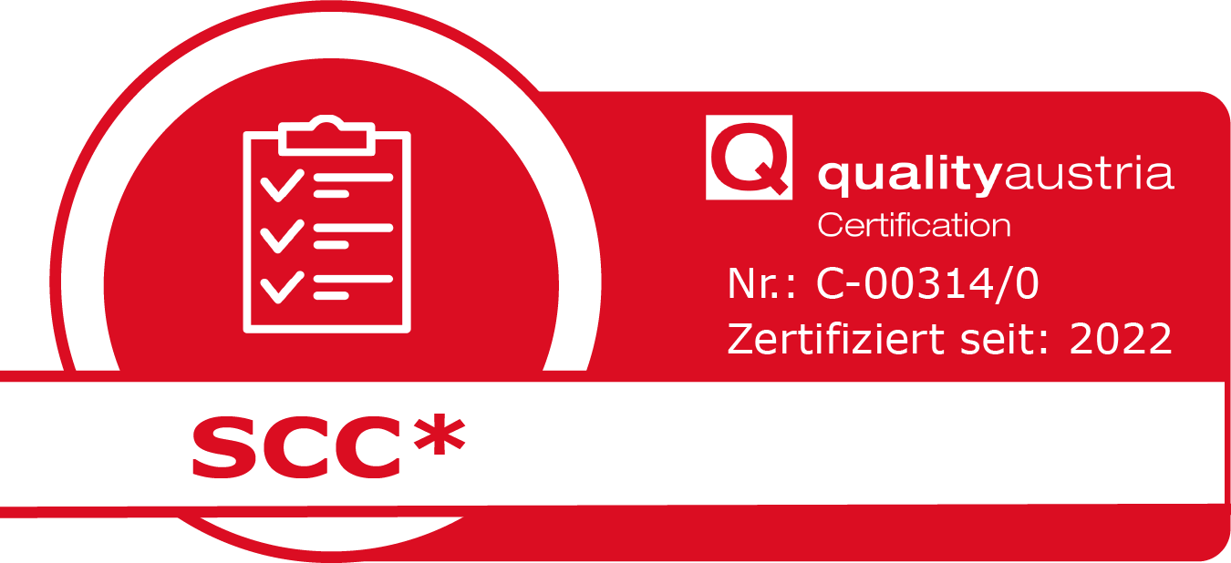 Mit der erfolgreichen SCC-Zertifizierung (Safety Certificate Contractors) zeigen wir, dass die Abläufe, Standards und Prozesse in unserem Unternehmen kontinuierlich sicherheitstechnisch weiterentwickelt und deren Einhaltung und Qualität regelmäßig extern überprüft werden. Die erstmalige Zertifizierung erfolgte im Jahr 2013 durch die unabhängige Zertifizierungsstelle SGS. Derzeit wird die laufende Überprüfung durch die Quality Austria Certification GmbH durchgeführt und regelmäßig im Zuge von Audits überprüft.